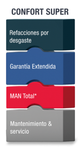 El contrato de servicio ComfortSuper, no solo cubre todos los trabajos de mantenimiento y revisión en el marco del mantenimiento periódico, sino también todas las reparaciones por desgaste y la reparación completa del vehículo. De este modo, este contrato cubre de forma integral todos los componentes de su vehículo que se someten a un gran esfuerzo y que suponen un coste elevado. Por supuesto, MAN Total también le ahorra los trámites administrativos con este contrato de servicio completo. Para una máxima seguridad incluso en caso de avería, puede cubrir el contrato ComfortSuper con la garantía de disponibilidad de MAN.